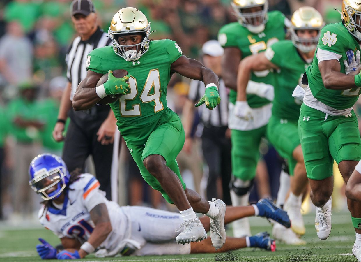 Notre Dame defeated Arkansas 56-13 on September 27, 2025, with a dominant performance that featured freshman quarterback CJ Carr throwing for four touchdowns and running back Jeremiyah Love scoring four touchdowns in the first half alone (two rushing and two receiving). The victory was a key one for the Fighting Irish, improving their record to 2-2 and showcasing a significant improvement in their defense, which held an Arkansas offense that had been scoring at a high rate to only 13 points